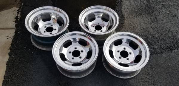 (4) Vintage Polished Slotted (American Racing Equipment / Halibrand?) Aluminum 15" Race Wheels (2) are 5 on 4.75 x 15 x 7" wide, $400 pair (2) are DEEP Slot (Halibrand Race Style) 5 on 4.5 x 15 x...